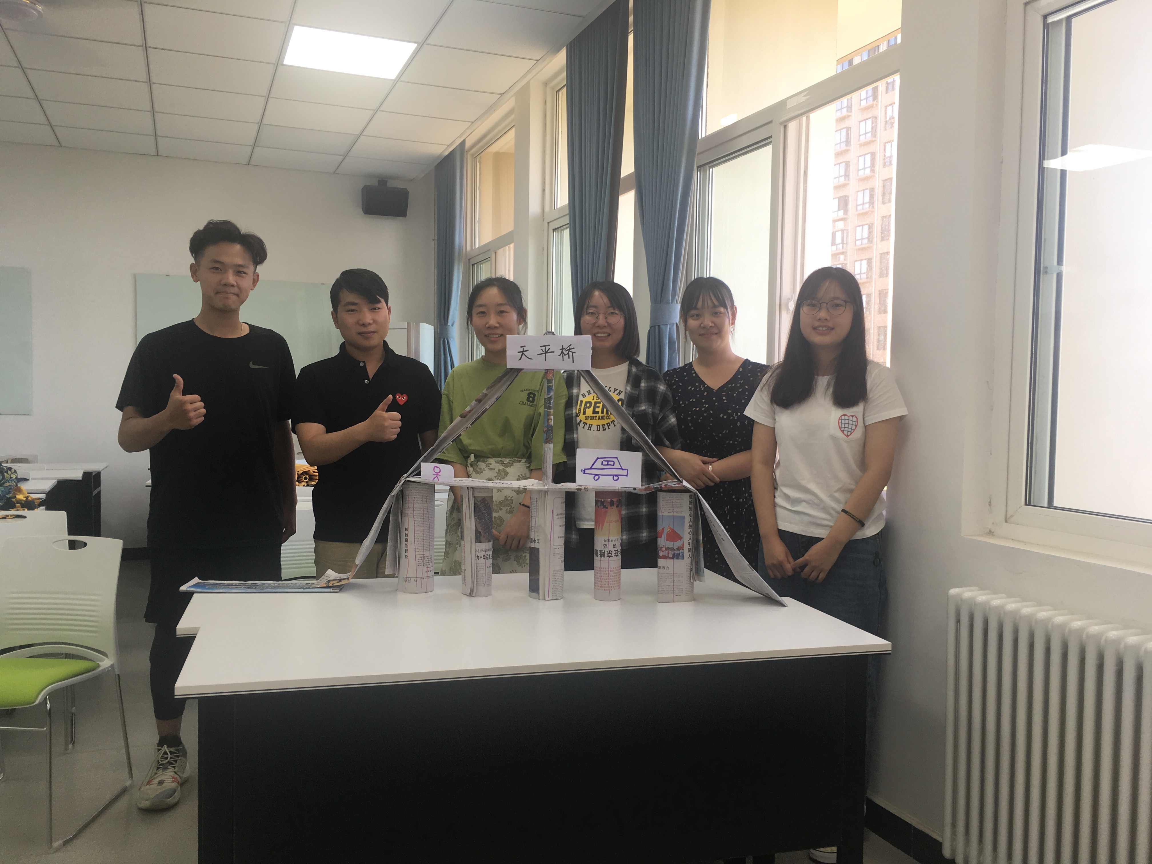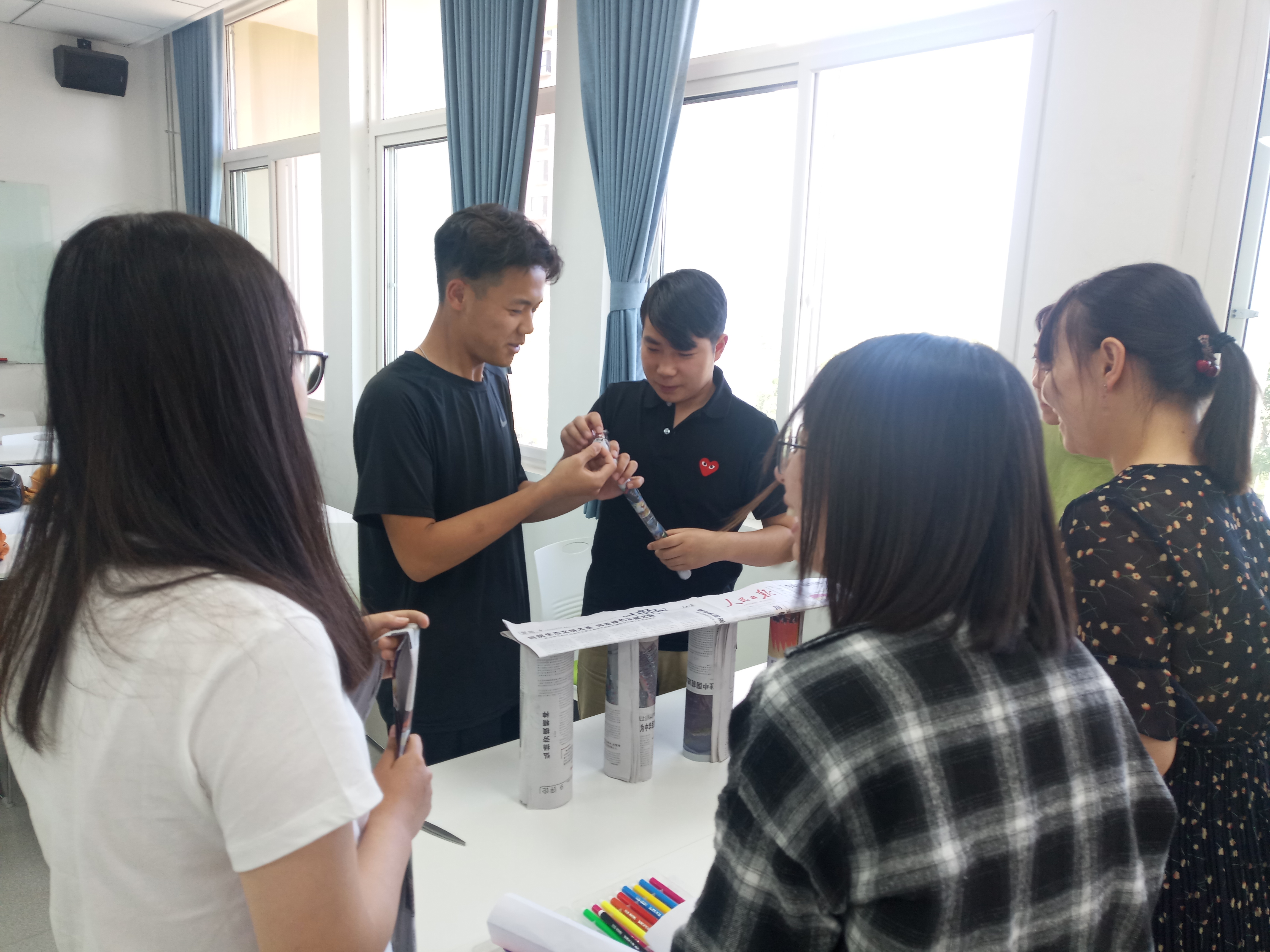 本次团训主题为“在团结协作中凝聚你我”。 团队任务是在限定时间内,团队成员在不用语言交流的情况下,合力用废旧报纸搭建制作一座桥。在进行了简单的热身游戏后,同学们分别组建自己的团队,充满信心地开始了紧张的制作,虽然不能用语言沟通,但在动作、眼神地默契配合下,大家智慧碰撞,失败中不抱怨不气馁及时汲取经验,历经周折,各个团队成员很快达成一致,在团结协作中圆满完成任务。整个团训过程同学们的参与积极性很高,尤其在分享环节,大家发言踊跃,每个团队都介绍了自己的作品,主动与他人分享自己在活动中的体会和收获,大家纷纷表示,任务成功的最大助力是“克服困难的毅力和良好的团队意识”,现场掌声不断。