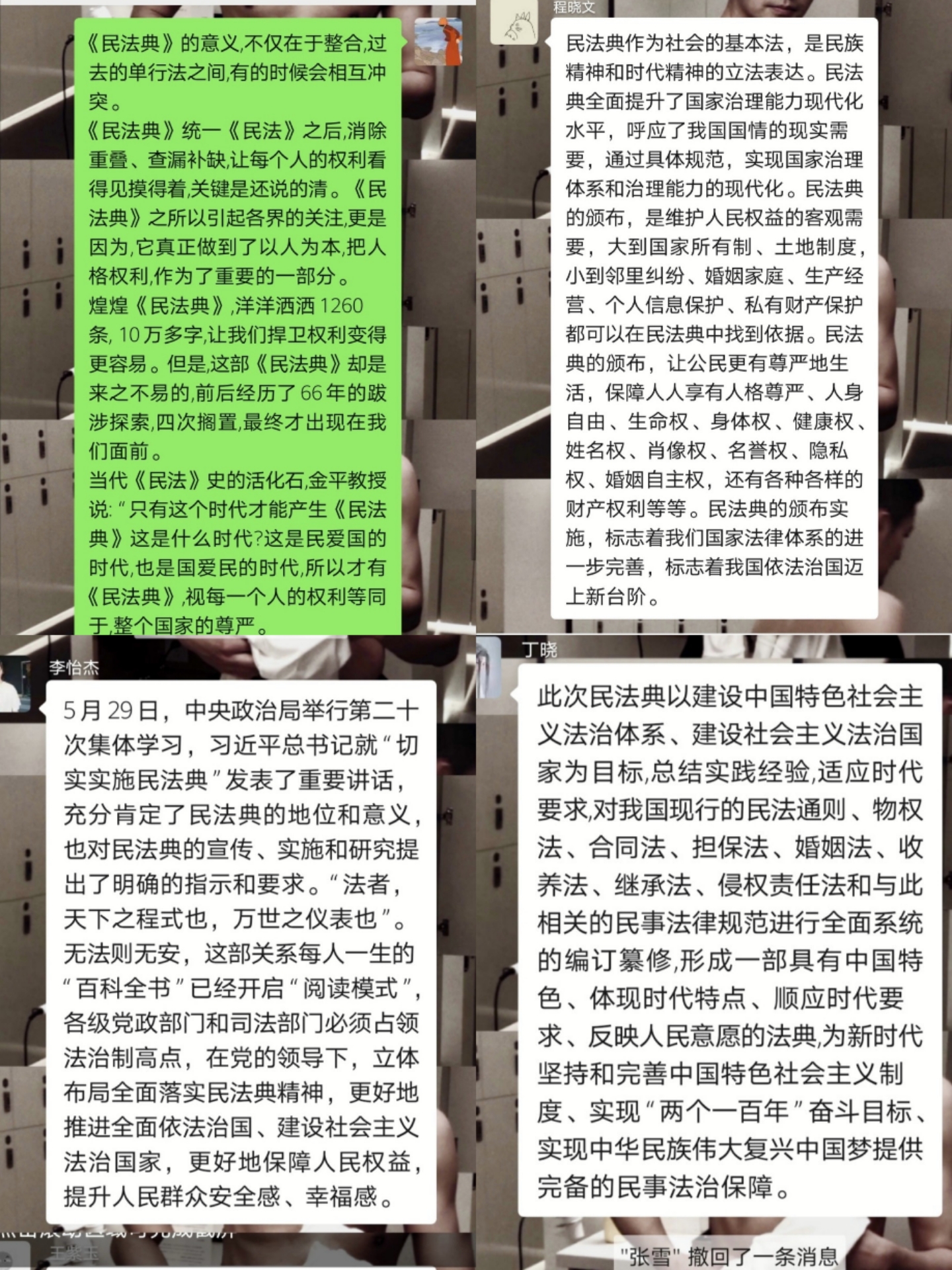 同学们先后观看了由公司杨宗科董事长和韩松、张翔等几位教授主讲的“解读《民法典》”系列讲座。通过讲座视频的学习,同学们了解到这是一部关系公众社会活动的法律,影响着每一个人的工作、学习和生活,尤其是邻里纠纷、家庭矛盾的调解中发挥“基本”作用。大家普遍感觉到,民法典是为老百姓打造一个公平正义的环境,为老百姓的幸福保驾护航。
