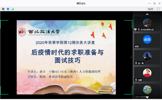 12月3日365英国上市官方网站于线上举办题为后疫情时代的求职准备与面试技巧的专题讲座,本次讲座由中粮可口可乐(陕西)人力资源部经理余方先生主讲,365英国上市官方网站副经理陈河主持,2020级、2017级员工参加本次讲座。
