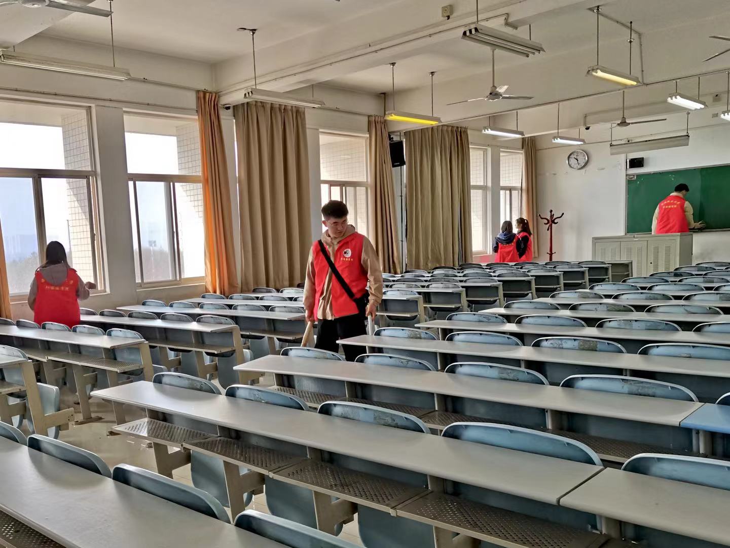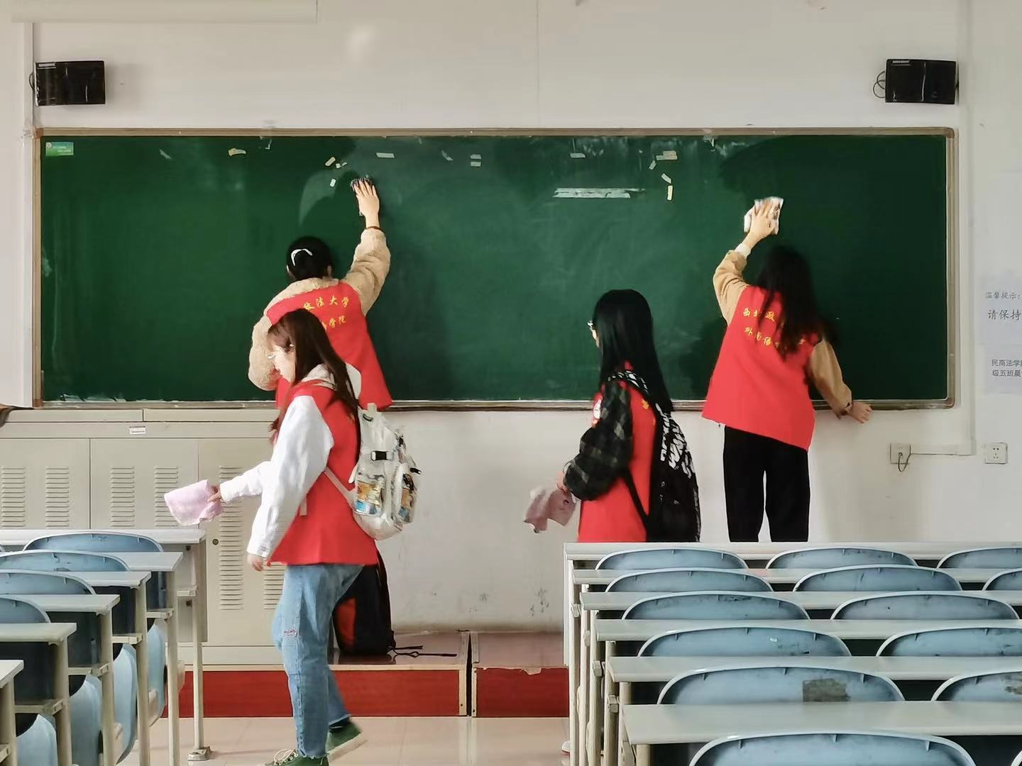 为了有序展开活动,志愿者们分为两组,负责不同区域的清扫。大家的情绪都很高涨,细心的同学将桌椅的正反面都细细的擦拭。门、黑板讲台的死角都被擦的干干净净。热火朝天的劳动现场充分展示了政法学子阳光向上,精神饱满的良好状态,更为同学们营造了一个“安全、健康、和谐、尚美”的环境氛围。
