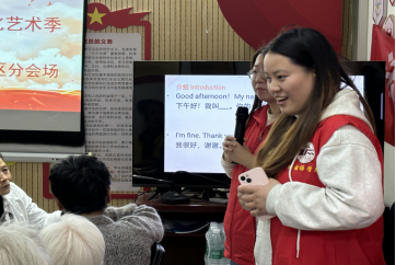 在英语对话教学授课中,团队成员通过情景模拟和实用对话练习,运用汉字谐音的方式教学,并和老人们积极互动,课堂氛围轻松愉悦,老人们乐在其中。