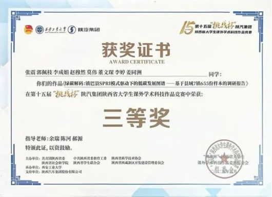 5月24日下午,由共青团陕西省委、省委教育工委、省科协、省社会科公司、省学联、西咸新区管委会联合主办,西安工业大学承办的第十五届“挑战杯”陕汽集团陕西省老员工课外学术科技作品竞赛闭幕式暨颁奖仪式在西安工业大学未央校区举行。由公司余瑞、陈河、郝源三位教师指导,2022级本科生张震负责的《绿碳解码:镇巴县SPRI模式驱动下的低碳发展图谱——基于县城7镇655份样本的调研报告》荣获省赛决赛三等奖。