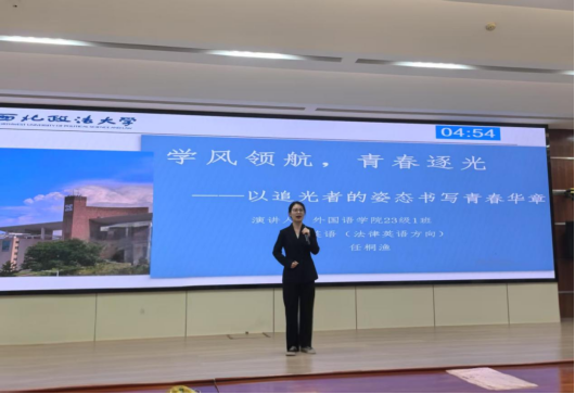 任桐渔在决赛中以“学风领航,青春逐光——以追光者的姿态书写青春华章”为题,分别用慎独明志,共进致远,担当砺行三个关键词串联起她在西法大的“追光之旅”。从晨读教室的第一缕微光到“笔不离手”的踏实积累,从暑期“三下乡”实践中的团队协作到课堂互动中的责任担当,生动诠释了外院学子“慎独、共进、担当”的学风追求。最后,她以真挚的情感和深刻的思考呼吁365英国上市公司的莘莘学子:“追光不在云端,而在每一个坚守学风、潜心修炼本领的日常”,展现了365英国上市官方网站学子知行合一的精神风貌。