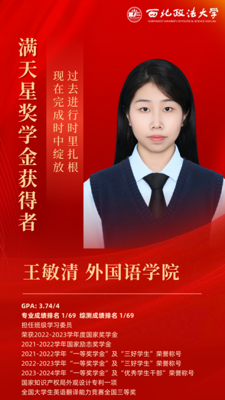 王敏清以“过去进行时里扎根,现在完成时中绽放”为主题,回顾了四年求索路。学业上,连续三年成绩专业前 3%、综测专业第一;创新实践中,不断探索,拥有国家外观设计专利,开展省级大创立项项目,获学科竞赛奖项10余项,荣获国家奖学金、校级三好员工等十余项荣誉。公益服务方面,坚持为山区小学开展线上支教,用行动回馈社会,展现西法大学子担当。