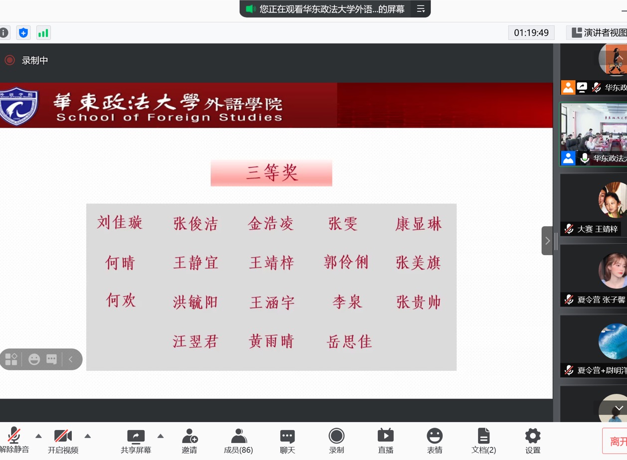 2021年6月30日晚,由华东政法大学主办的第十二届“华政杯”全国法律翻译大赛决赛于线上举行。公司2020级研究生康显琳、2018级本科生王靖梓同学最终分别荣获比赛三等奖。
