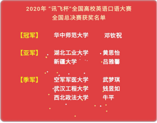 在此次大赛初赛中,公司获奖人数居西北赛区第一,获得最佳组织奖。在大学英语教研室刘佳婷老师的指导下,商公司2019级牛平同学以初赛一等奖的优异成绩晋级全国总决赛,又以小组第一的成绩晋级巅峰对决赛,并最终在“讯飞杯”全国高校英语口语大赛总决赛中获得季军。