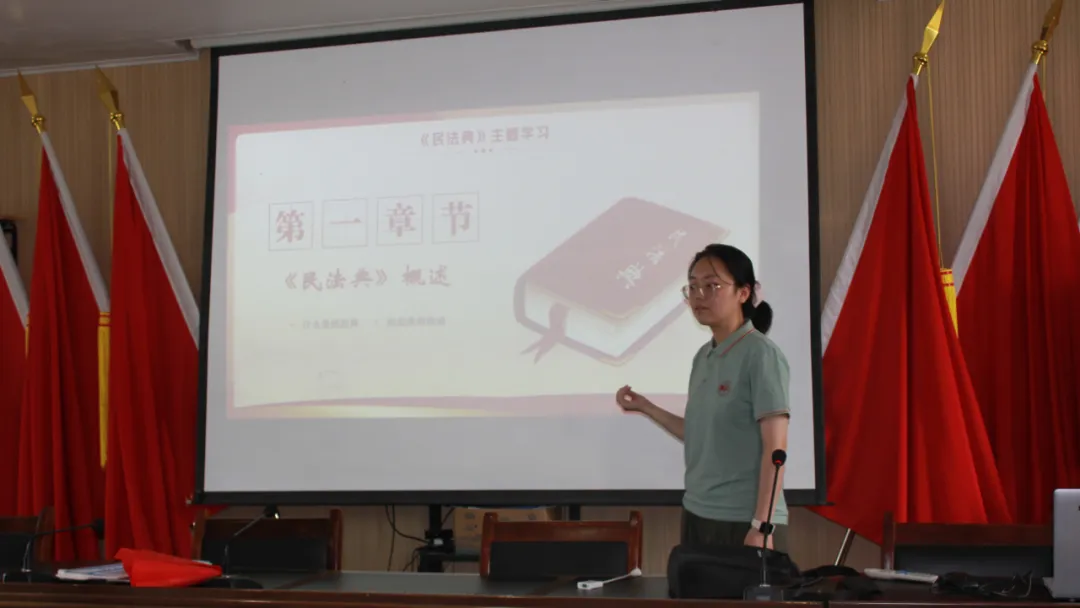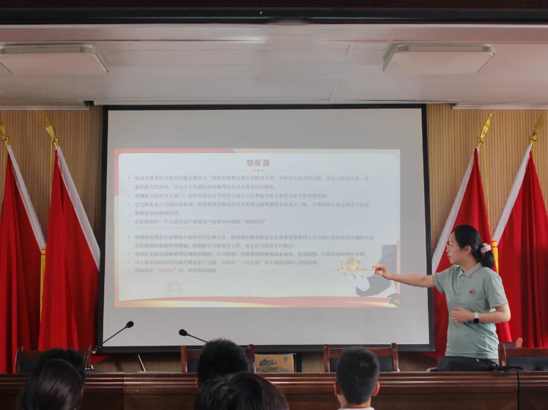 首先,实践团成员詹明珠向村民和孩子们系统讲解了民法典的核心内容,从概述入手,介绍了这部法典基本定位与体系框架,阐明其编纂对于完善法律体系、保障公民权益、促进社会发展的重要意义。随后,成员聚焦与乡村生活紧密相关的物权篇、合同篇和婚姻家庭篇,用“案例+法条”的方式与村民和孩子们进行细致解读。