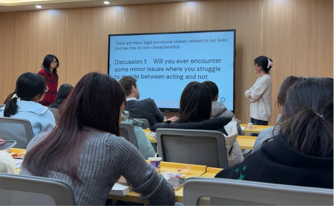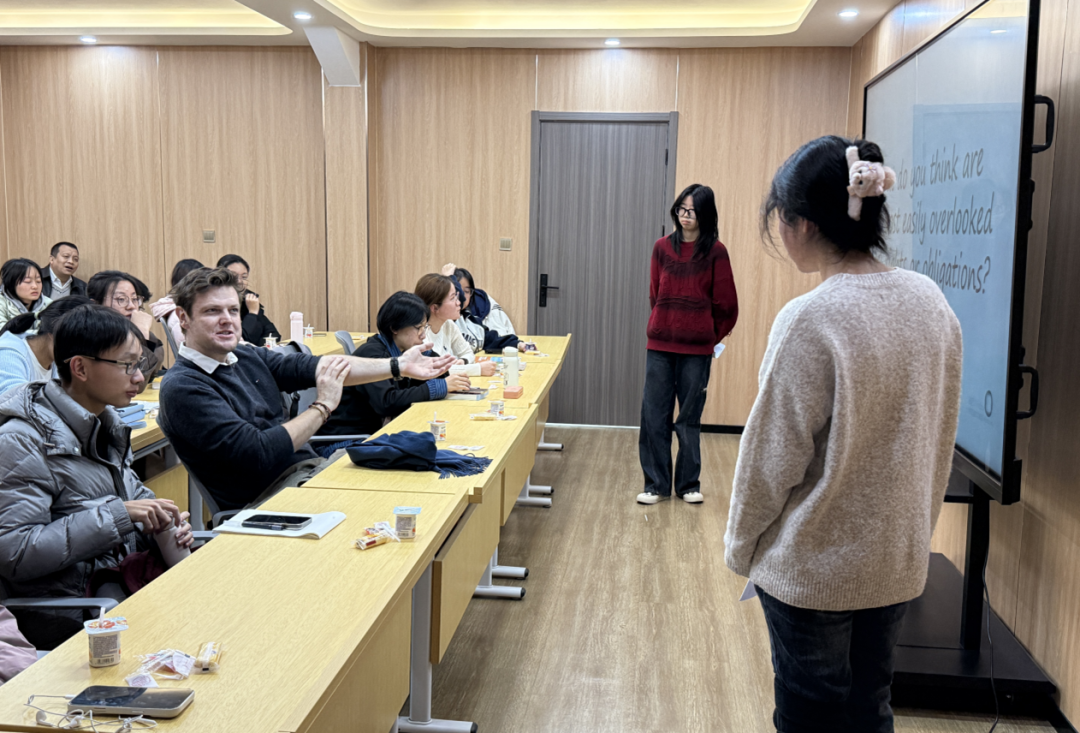 接着,大家围绕“宪法如何走进生活”展开讨论,在问答环节中,当被问到“看到他人权利受侵害时,你会站出来吗”, 同学们纷纷表达:“如果有法律在身后支持,并且对方处于弱势——我们愿意成为那个站出来的人。”外教Cameron也提醒我们:“自己的安全要放在第一位。在保护自身安全的前提下,伸出正义之手帮助他人的维护其合法权利,也是我们身为政法学子的担当,要勇敢维护社会的正义和公平。