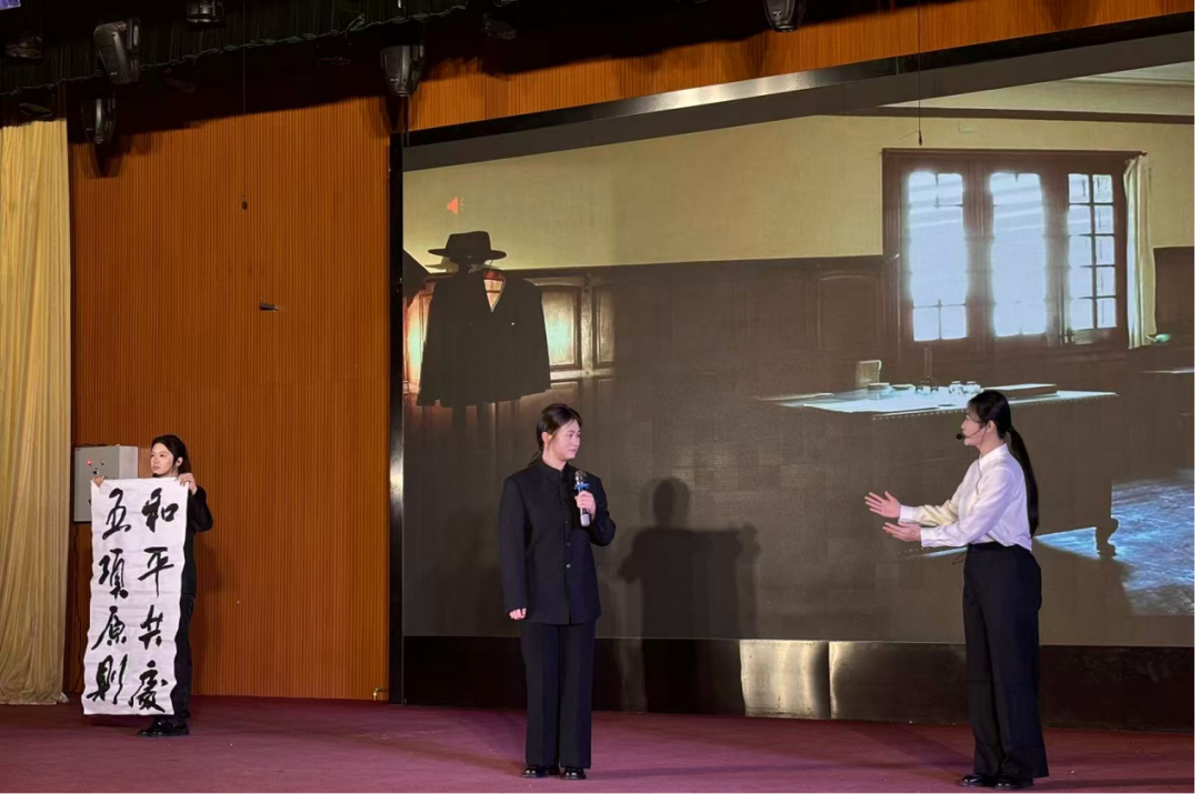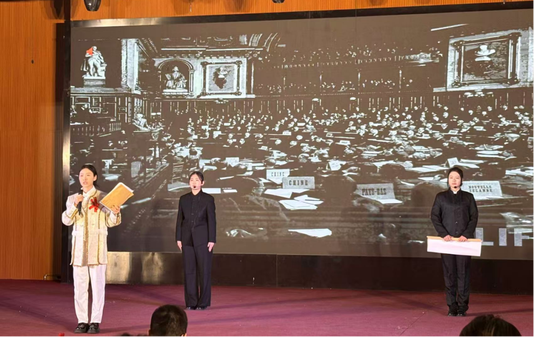 语通寰宇,志屹山河。百年外交风云,是跨越语言的对话,是大国风骨的回响。外国语学子们围绕“弱国无外交”的百年沧桑与“大国外交”的时代辉煌,将顾维钧巴黎和会据理力争的悲愤、周恩来万隆会议求同存异的智慧、乔冠华联合国席位恢复掷地有声的宣告、新时代人类命运共同体的大国担当次第呈现。