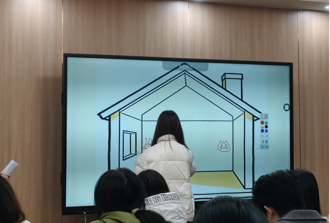 活动伊始,破冰游戏“我们的幸福小屋”激发了同学们的交流热情。主持人展示出一幅空白的房屋轮廓,每位同学轮流执笔,在小屋中添上一件能代表自己幸福感的事物——一张舒适的大床、一只可爱的小猫、一个印有偶像照片的小卡、一个美味的大蛋糕……简单的线条里,盛满了独属于每个人的幸福注脚。