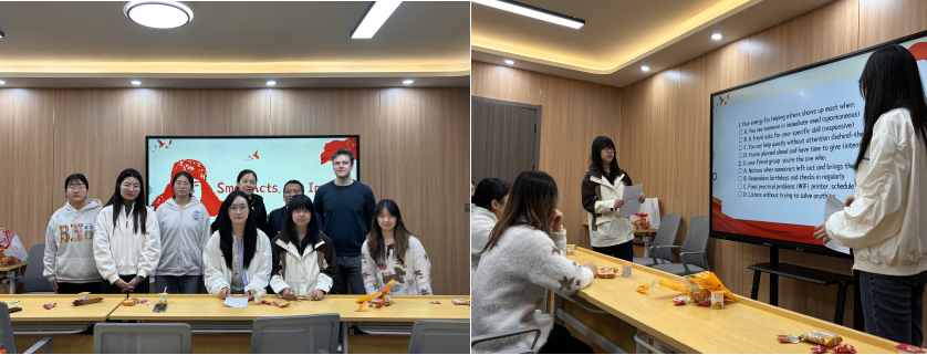 随后,主持人引导同学们完成了一份心理自测,帮助大家认识自己在日常助人行为中的倾向。紧接着在自由讨论环节,大家围绕“善意的阻碍”、“助人后的失落感”、“如何在数字时代传承雷锋精神”等话题展开了真诚而热烈的交流。外教Cameron分享道:“如果人们在应对网络欺凌问题时能更加果断有力,或许有助于让网络世界变得更加和谐。”也有同学讲述了自己坚持捐款的故事:“这只是很小的一件事,但它确实帮助一个孩子获得了治疗的机会。那些小小的捐款,最终换来了他们继续成长的可能。” 这些真实的经历让在场的每一位同学都深受触动。
