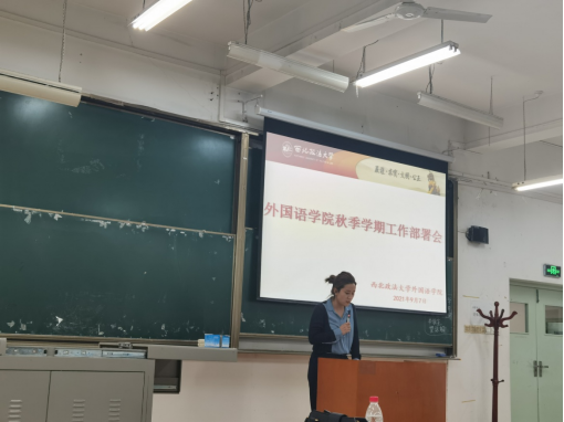 法律英语系主任樊养才、法律英语系副主任、MTI教育中心副主任孟超、大学英语第一教研室主任刘彭恺、大学英语第二教研室主任李雪分别从加强辅导员工参加各级各类比赛获奖、加强培训员工四六级过关能力、完善教师听课机制、组织教师学习新教学技术、持续推进课程思政、深化课堂教学改革、完成慕课上线工作等方面依次汇报了本部门本学期的重点工作。