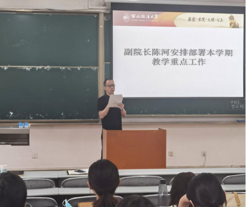 副经理陈河对本学期教学重点工作作出安排:一是平稳推进疫情防控常态化教学运行工作,二是加强一流专业内涵建设,三是持续推动一流课程建设,四是优化提升外语课程思政建设,五是打造独具特色的第二课堂品牌,并对公司科研工作提出相关举措。