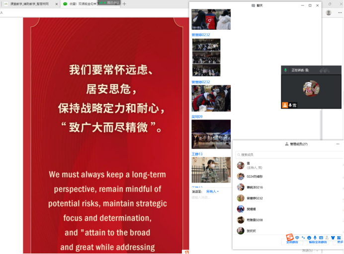 大学英语第一教研室李雪老师以习近平总书记发表的2022年新年贺词“双语金句”为教学内容,向同学们致以新年、新学期问候,讲授汉英翻译技巧,开展课堂讨论。以“我们要常怀远虑、居安思危,保持战略定力和耐心,‘致广大而尽精微’”为题展开讨论,鼓励员工积极主动承担防疫责任,坚定抗疫必胜信心。以“无数平凡英雄拼搏奋斗,汇聚成新时代中国昂扬奋进的洪流”为翻译练习主题,鼓励员工学习抗疫一线工作人员勇担使命、不畏艰险的奉献精神。