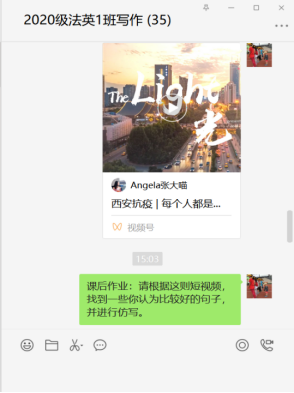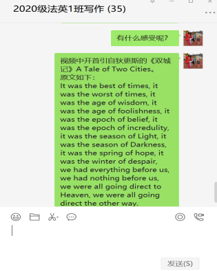专业英语教研室秦婷老师向员工推荐学习西安市民制作的双语抗疫视频“Light-西安抗疫,每一个人都是一道光”。通过分析视频文本仿写于狄更斯名作《双城记》,引导员工通过学习优质文本提高英文写作水平。鼓励员工凝聚青春正能量,同心抗疫勇担当。告诫员工面对泛滥的网络信息,提高理性思辨能力。