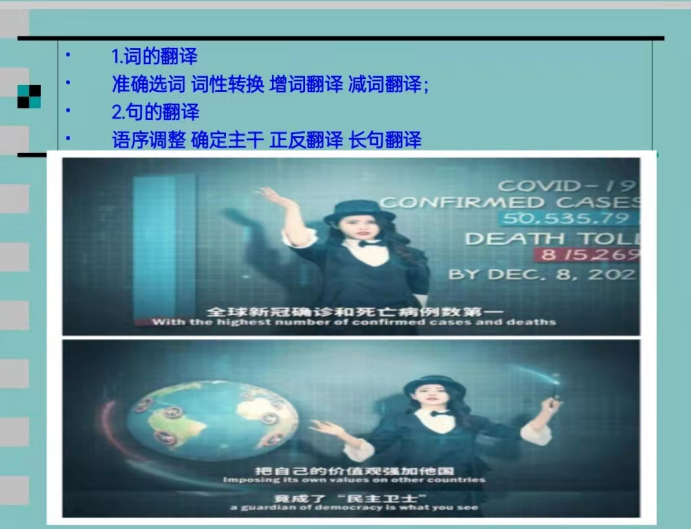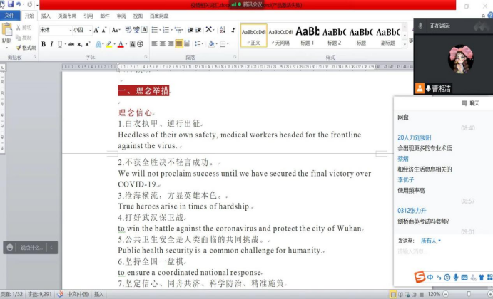 专业英语教研室陈河老师以新华社驻美记者王迪迩制作的,在海内外网络上刷屏的“中美抗疫差距”双语视频为教学素材,围绕文本精准汉英表达,引导员工实践语言应用中的功能对等。同时帮助员工了解美式民主的多重局限与弊病,以及中国抗疫斗争中彰显的中国特色社会主义制度优越性,培养员工的“四个自信”。