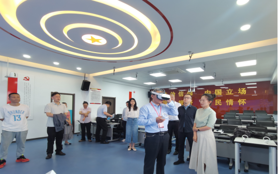 随后,郭宝龙教授亲自体验了公司外语虚拟仿真教学项目中的“国际组织事务多语种磋商虚拟仿真”课程,高度肯定了该课程的沉浸式虚拟仿真技术及智慧自主学习功能。