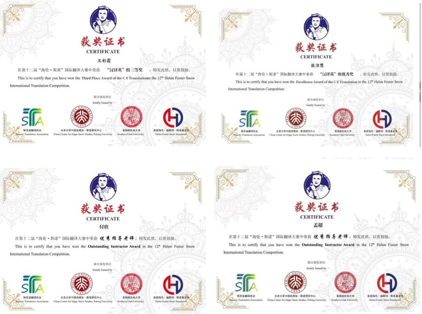 近日,第十二届“海伦·斯诺”国际翻译大赛组委会公布获奖名单,公司2023级研究生王彩霞、2024级研究生张洁慧分获汉译英组三等奖、优秀奖,公司法律翻译中心主任付欣副教授,英语系主任、MTI教育中心副主任孟超博士获得“优秀指导教师”荣誉称号。