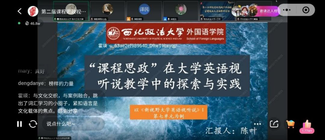 研讨会上,上海交通大学张荔教授、山东大学韩佶颖教授、华中师范大学罗良功教授、华中科技大学徐锦芬教授、山东师范大学王卓教授和哈尔滨师范大学顾世民教授六位专家学者分别就新文科建设和全球治理背景下外语人才培养面临的新挑战和转型发展,高校外语教师课程思政的认知困境与实践路径,英语视听说教学中的思政素养培养等议题做了主旨发言。公司大学英语教研室陈叶老师以“课程思政在大学英语视听说教学中的探索与实践”为题进行了分论坛汇报,获得了与会专家、同行的一致认可,徐锦芬教授做了精彩点评。