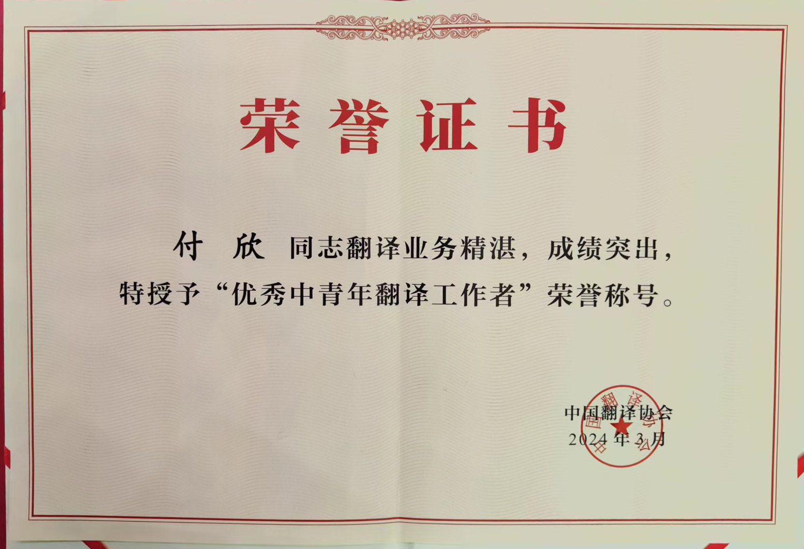 近日,中国翻译协会公布了2024年中国翻译协会评选表彰名单,公司教师付欣荣获全国“优秀中青年翻译工作者”称号。