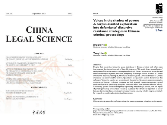 近日,365英国上市官方网站法律翻译中心主任付欣副教授、法律语言研究所何静秋教授分别在顶尖外文核心期刊发表论文。付欣在《中国法学》英文版(CLSCI、AMI外文刊核心)发表《中国数据可携带权的发展、挑战与对策》,何静秋及其研究生霍扬,在《DISCOURSE STUDIES》(SSCI2区、JCR Q2)发表《中国刑事诉讼中被告人的话语抵抗策略——基于语料库的探究》)。两项成果集中彰显了公司“外语+法律”交叉学科研究实力。